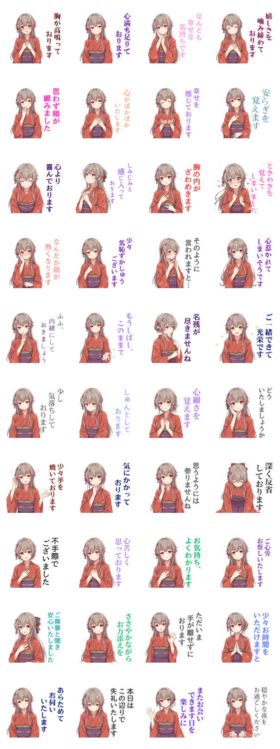 | スタンプ説明 | 大正浪漫な雰囲気ただよう、ハイカラで上品な女性のスタンプです。 日常で使いやすい丁寧な言葉を中心に、やさしく可愛らしい表情で気持ちを伝えます。 |