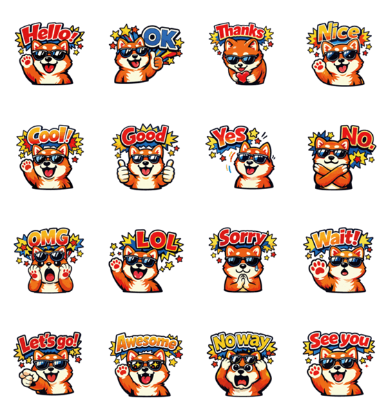 | スタンプ説明 | メリカンポップなデザインの柴犬スタンプ。クールで明るい表情と英語フレーズで日常会話にぴったり。使いやすいリアクションが揃っており、気軽に楽しく使えるスタンプです |