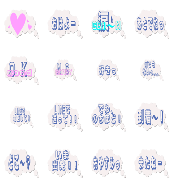 | スタンプ説明 | 他のキャラクターや、吹き出しともアレンジできるかわいい雲型のスタンプです♪基本的な単語のみにしました。 |