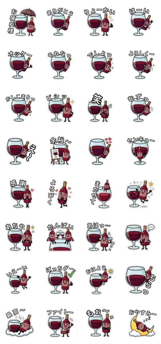 | スタンプ説明 | ゆるくてちょっと大人な「いきなりワイン」の日常スタンプ。 毎日使える言葉を、ワインと一緒にお届けします |