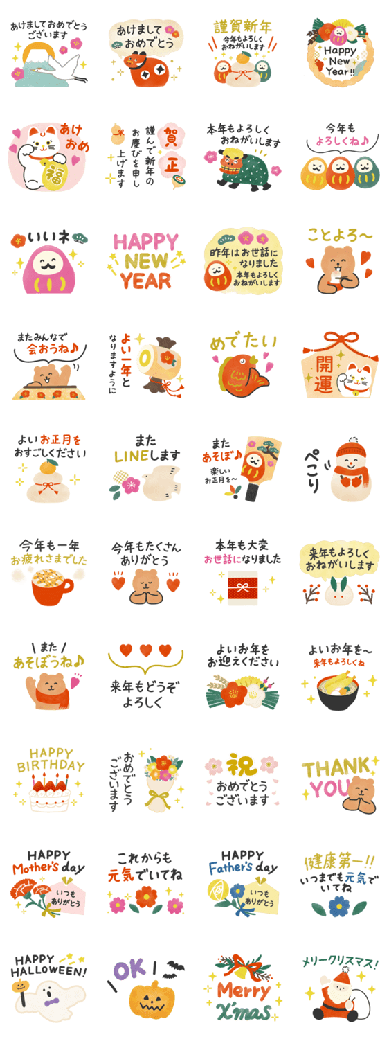 | スタンプ説明 | ふんわりタッチのやさしいスタンプです。お正月・年末年始に加えて季節のお祝い入りで1年中使えます。 ※こちらは再販になります 年賀状/母の日/父の日/誕生日/入学祝い |