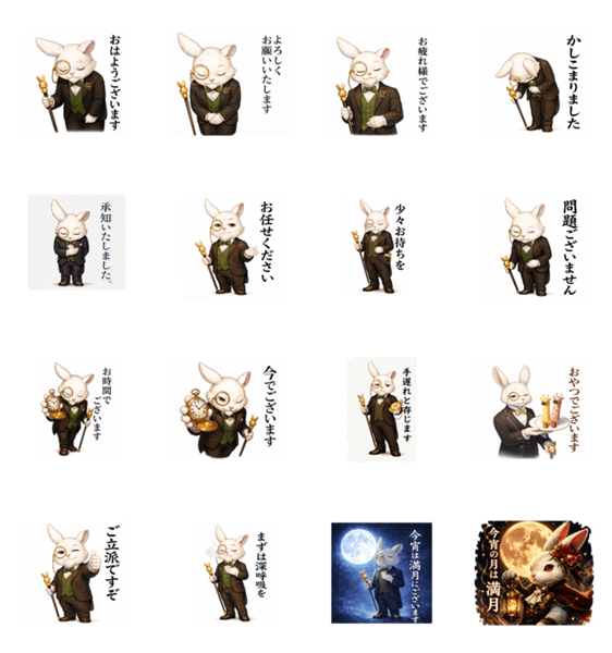 | スタンプ説明 | 鬼ガール・シャシーのウサギ執事アル爺が、癒しをお届け。そっと寄り添い、疲れた心をふんわり包みます。シャシーのチョコこん棒で月待ちウサギに変身?! |