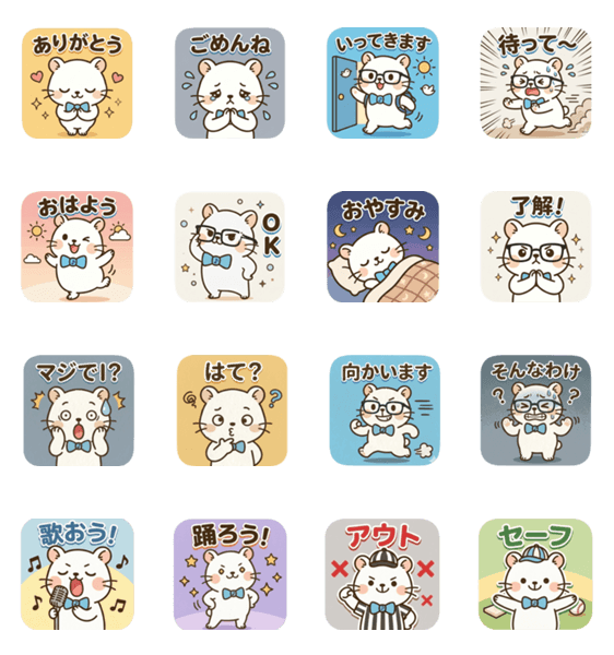 | スタンプ説明 | 音楽をこよなく愛する、白くて丸い不思議なハムスターが登場! トレードマークは、真ん中に**「四分音符」**が入った水色の蝶ネクタイ! |