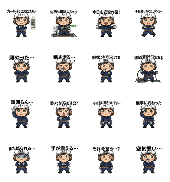 | スタンプ説明 | 電気工事士・電工・現場職人・現場監督のためのスタンプ「電工ちゃん」。 現場連絡や仕事のやり取り、日常の会話にも使える電気工事スタンプです。 |