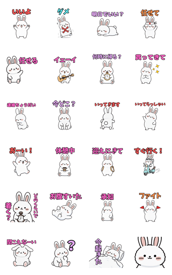 | スタンプ説明 | 毎日のLINEで使いやすいシンプルなうさぎスタンプ第二弾。 日常会話でよく使う言葉を中心に収録。友達・家族・恋人とのトークにぴったりのスタンプです。 |