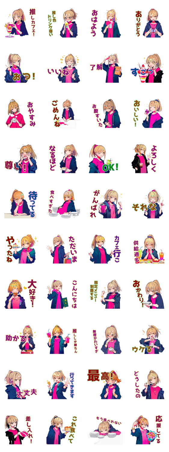 | スタンプ説明 | 推し活女子にオススメ!コラボカフェ巡りを楽しむオタクちゃんスタンプ/推し活/オタク/カフェ/尊い/沼/日常/挨拶/かわいい/萌え/女子/アクスタ/癒し/ゆるい |