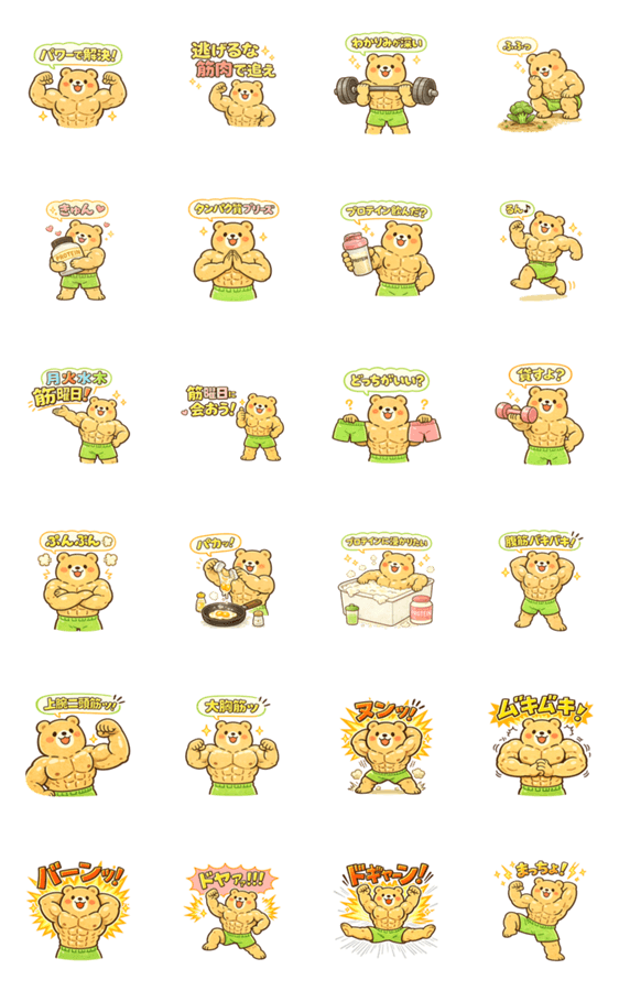 | スタンプ説明 | 筋肉ネタ全開で会話が盛り上がる!ジム・筋トレ・プロテイン好きに刺さる、ゆるかわマッチョくま第4弾! |