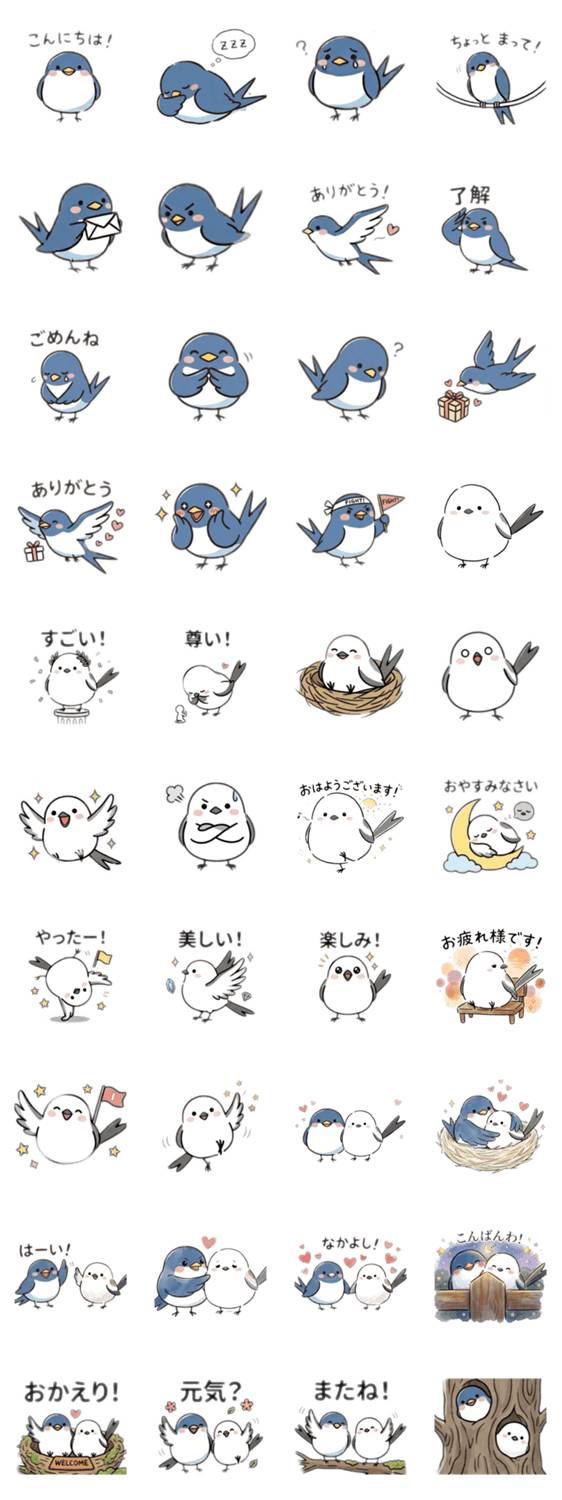 | スタンプ説明 | 春を運ぶツバメとシマエナガのコンビがスタンプに!毎日のトークで使いやすいポーズを40種類詰め込みました。春の訪れを感じる鳥さんたちと一緒に、会話を楽しみましょう♪ |