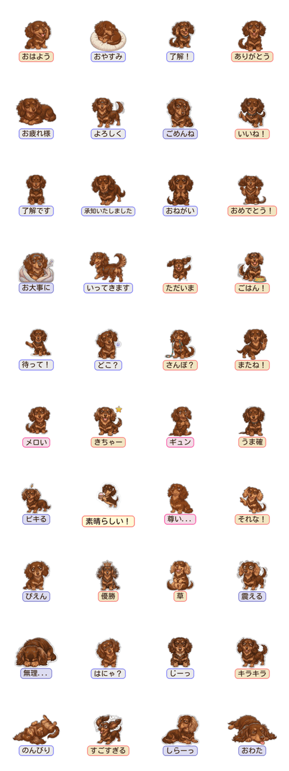 | スタンプ説明 | チョコタンのミニチュアダックスの喜怒哀楽スタンプ!かわいい表情で毎日の気持ちを伝えよう。ダックスフント好きにおすすめ! |