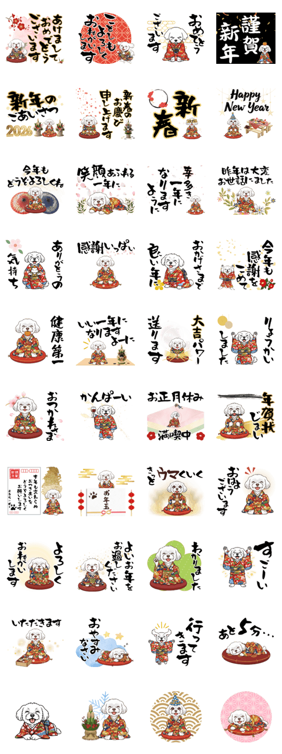 | スタンプ説明 | 着物姿のマルチーズが新年のごあいさつを可愛くお届け。あけおめ、ことよろ、年越し、お年玉、挨拶など、お正月に使いやすい言葉と表情がそろっています。 |