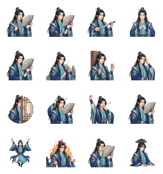 | スタンプ説明 | Expressive gestures of an ancient Chinese hero without text. |