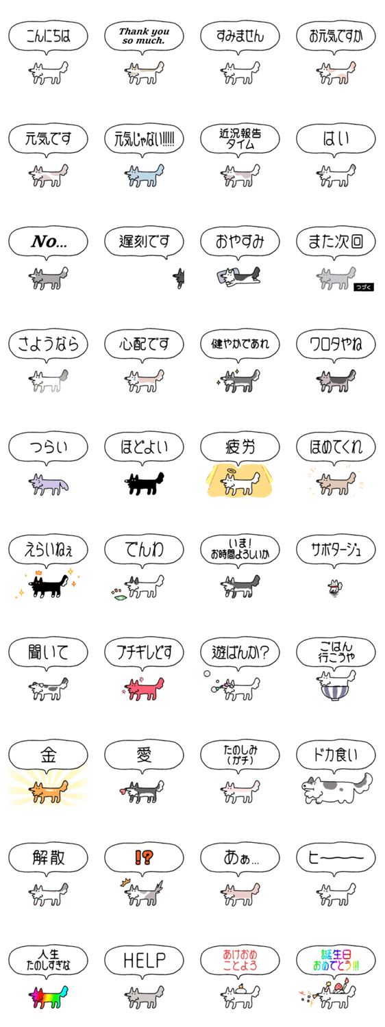 | スタンプ説明 | 家族・友達・恋人に連絡を送ろう。何もかもが一回り大きくなったぞ!! 内容自体は定期連絡犬と一緒です!!!元気か? |