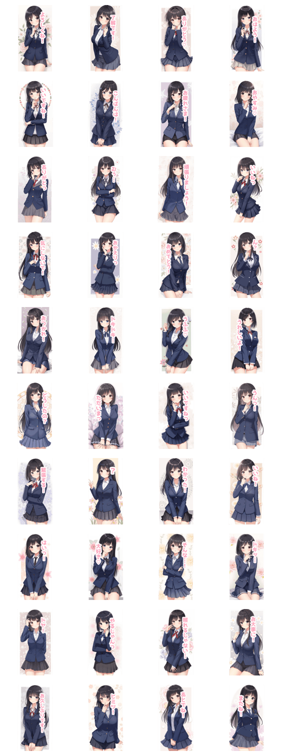 | スタンプ説明 | 学校/カジュアル/女の子/JK/かわいい/癒し/萌え/日常/挨拶/使いやすい/ガール/美少女/ブラック/ロングヘア/ナチュラル/会話/返信/制服/学生/生活/女子高生/高校生 ※このスタンプはトークルームで大きく表示されるBIGスタンプです。 |