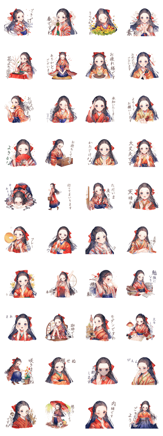 | スタンプ説明 | レトロな袴姿が可愛い春に使える丁寧な挨拶。大正ロマン/着物/敬語/学生/大人/女子/和風/美麗/卒業/入学/合格/先輩/同僚/友達/日常 |