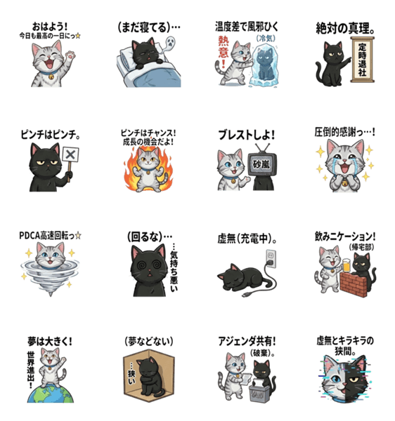 | スタンプ説明 | 舞台は「株式会社・無(む)」。やる気に満ち溢れすぎて眩しい新人「キラキラ猫」を迎え、虚無猫先輩の日常はさらなる深淵へ加速します。 |