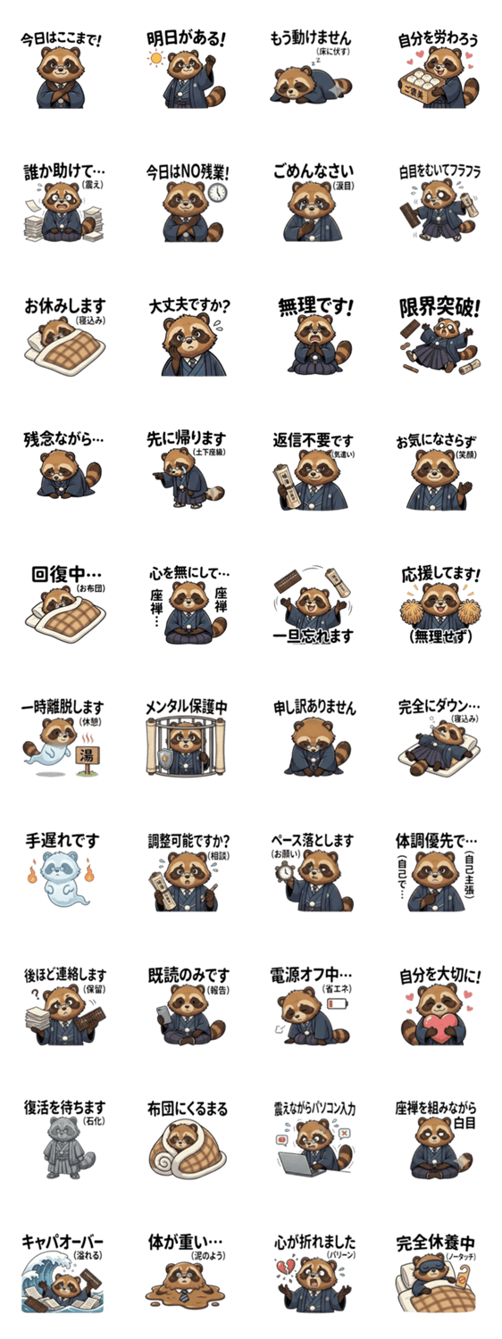 | スタンプ説明 | 限界オフィスの味方!事務侍タヌ右衛門が体調不良を可愛く代弁。角を立てずに「休みたい」「もう無理」を伝えます。 |