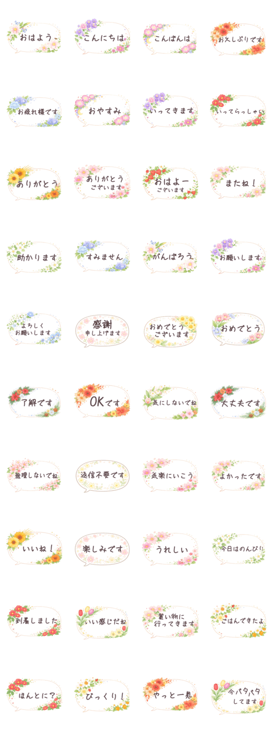 | スタンプ説明 | 毎日の気持ちをやさしく伝えるスタンプ。ありがとうやあいさつなど、日常で使いやすい表現をそろえました。誰にでもおくりやすい、ふんわり可愛い花柄のデザインです。 |