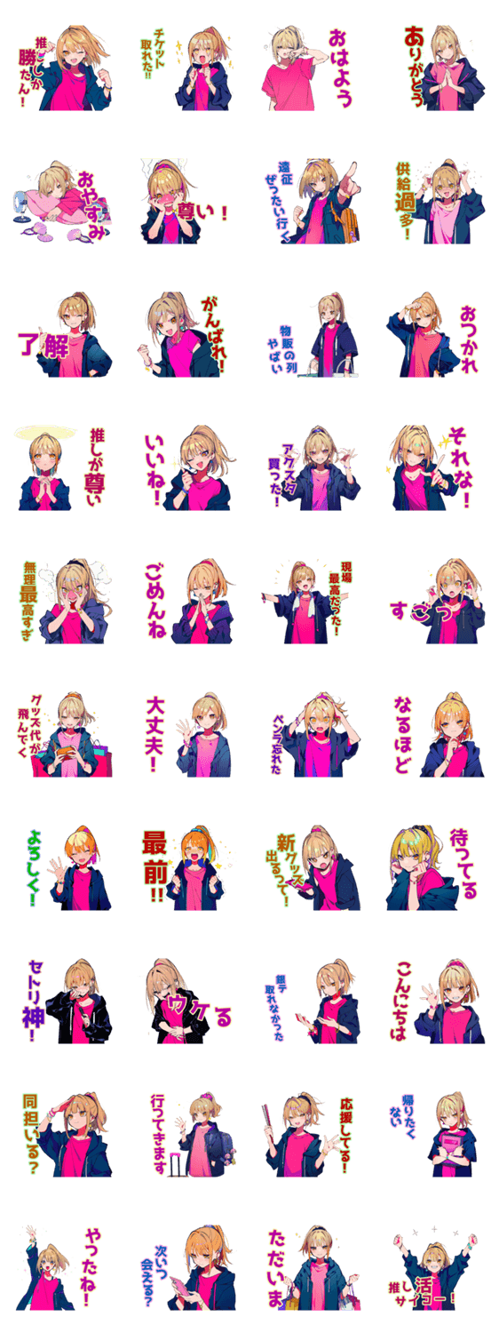 | スタンプ説明 | 推し活女子にオススメ!ライブ遠征あるあるスタンプ/推し/オタク/現場/日常/かわいい/挨拶/萌え/アクスタ/沼/物販/応援/友達/女子/毎日使える/尊い/癒し |