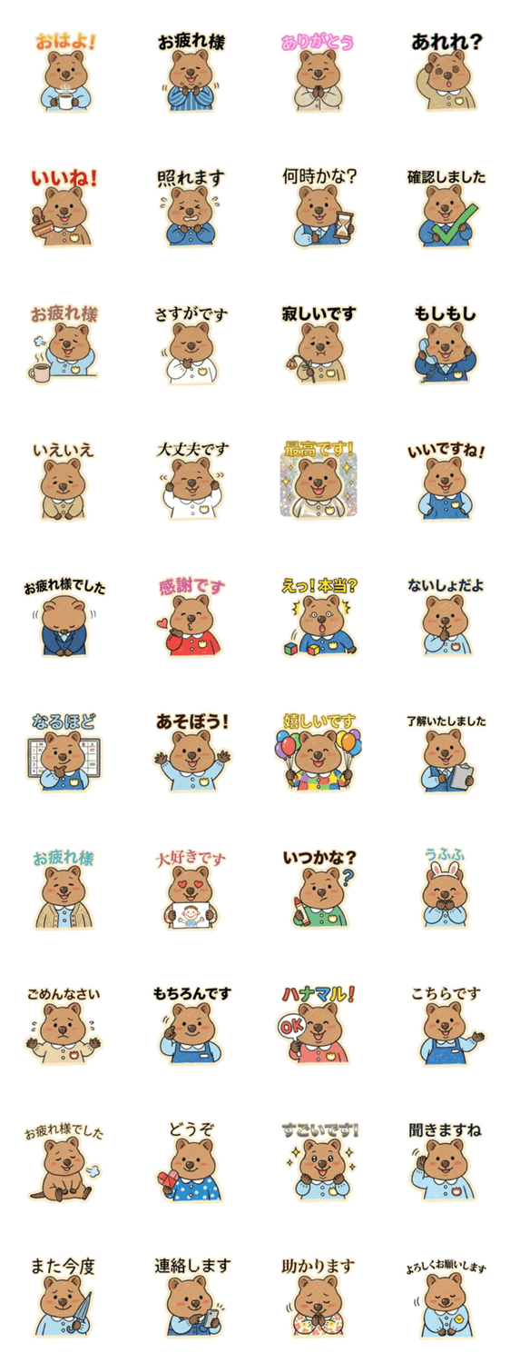 | スタンプ説明 | スモック姿の優しいクオッカ。子供や保護者、同僚とのやり取りを明るく彩る、ポジティブな言葉がたっぷり。 |
