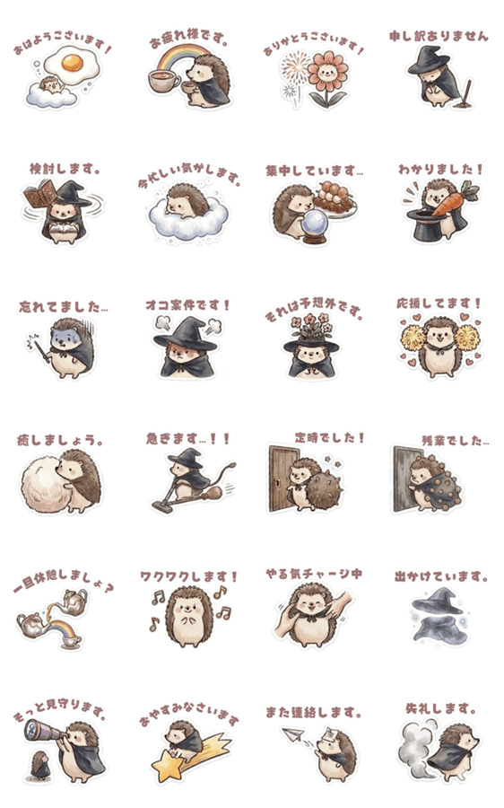 | スタンプ説明 | 魔法使い。でもどこかドジなハリネズミ「ちくまる」。北欧風のカラーで、大人可愛い雰囲気。仕事、日常、応援など、毎日使えるメッセージを作りました。女性におすすめ。 |