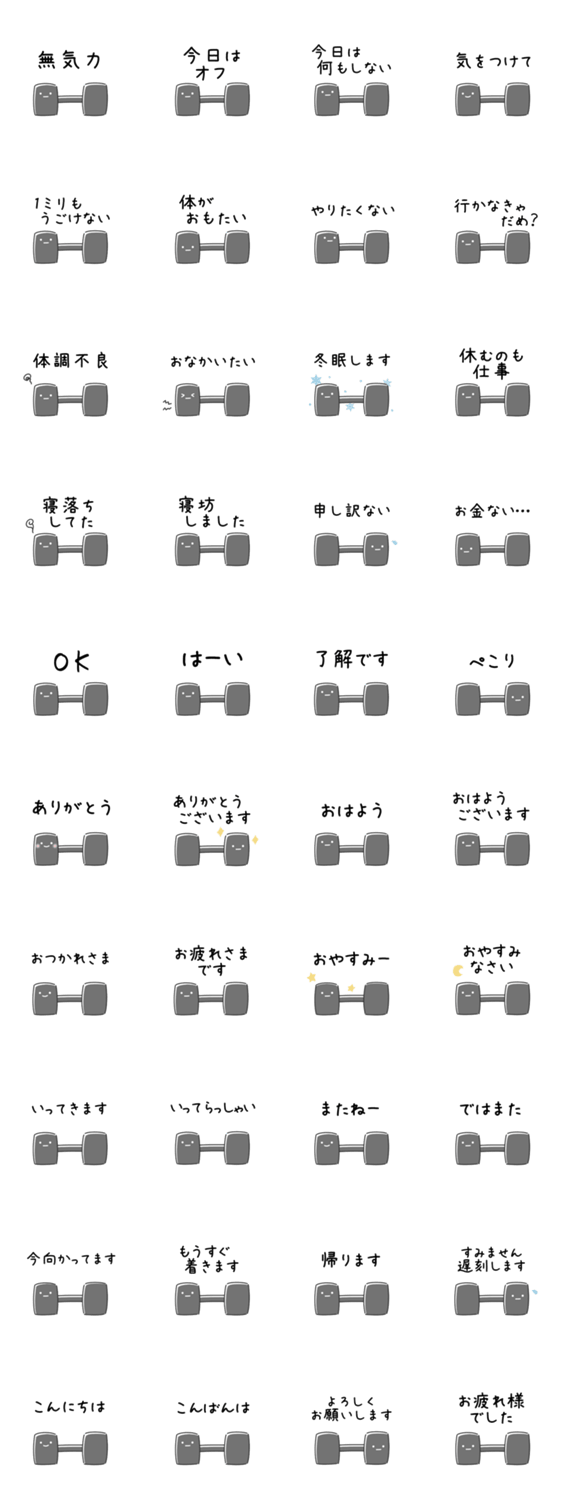 | スタンプ説明 | 無気力なダンベルの、シンプルでかわいいスタンプです。 (無気力/ネガティブ/毎日/日常/返事/リアクション/ダイエット/マッチョ/筋肉/ボディビル/ジム) |