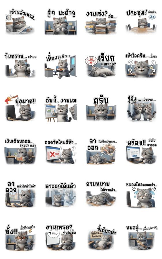 | スタンプ説明 | Meet the adorable and sassy Grey Tabby cat, expressing all your daily office vibes. Perfect for sharing with friends! |