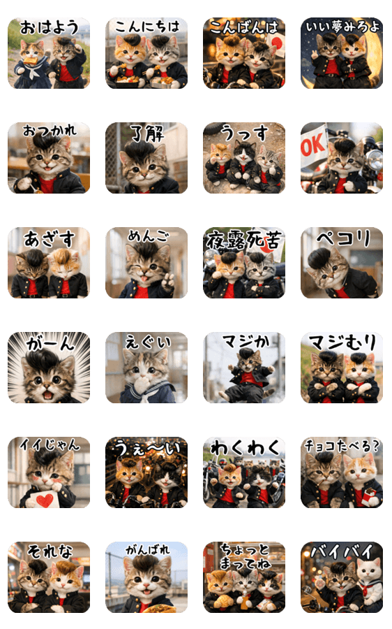 | スタンプ説明 | 飛び出す 猫 不良 日常スタンプ/うごく/動く/挨拶/ポップアップ/三毛猫/ヤンキー/茶トラ/ネタ/動物/子猫/実写/写真リアル/にゃんこ/ねこ/ねこちゃん/山田まぽん作 |