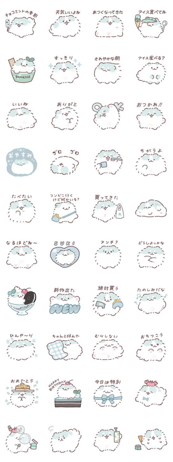 | スタンプ説明 | チョコミントのポメトーン。チョコレート色の線とミント色の毛色です。リラックス系が多いです。 |