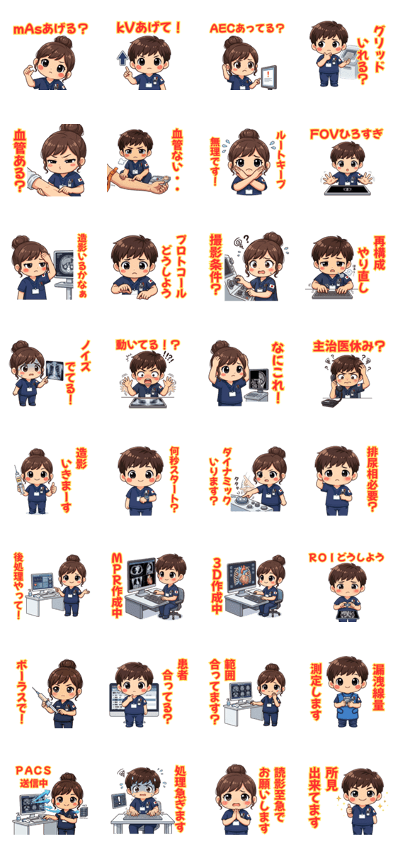 | スタンプ説明 | 【放射線技師限定】マニアック集 現場の「あるある」と「使いやすさ」を徹底追及! 清潔感あるキャラクターが、多忙なあなたの代わりに感情を伝えます。 |