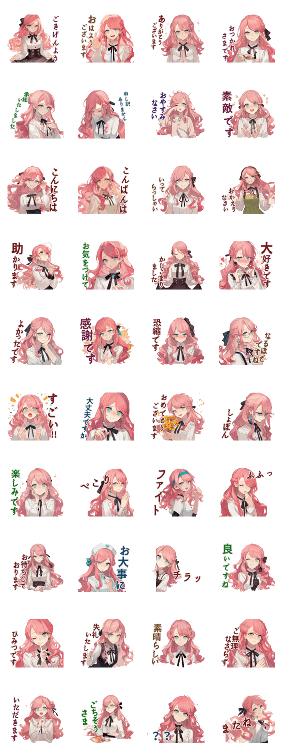 | スタンプ説明 | 清楚で綺麗な女の子のイラスト。先輩や上司にも使えます/敬語/丁寧/挨拶/日常/大人/女子/社会人/職場/学生/かわいい/美麗/推し/萌え/友達 |