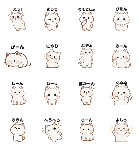 | スタンプ説明 | じわじわ笑える表情とリアクションを集めた、白ねこのスタンプです。かわいくて少し変な表現を、毎日使いやすくまとめました。 |