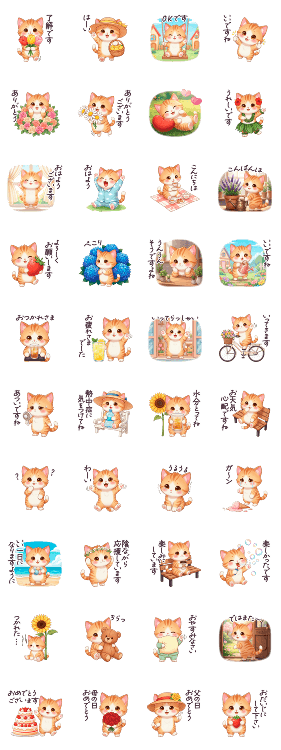 | スタンプ説明 | 茶トラ/連絡/挨拶/あいさつ/敬語/丁寧/グループ/家族/友達/ママ友/猫/ねこ/ネコ/子猫/子ねこ/ねこちゃん/春/初夏/いちご/チューリップ/年度末/新年度/母の日/父の日 |