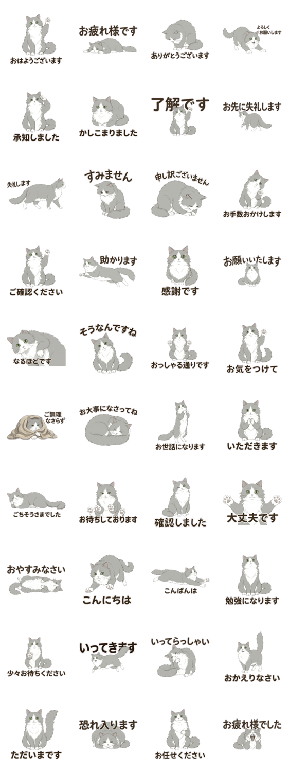 | スタンプ説明 | ふわふわ長毛のノルウェージャンフォレストキャットが敬語で気持ちを伝えるイラスト風スタンプ。ビジネスや目上の方へのご挨拶に便利な丁寧フレーズが揃っています。 |