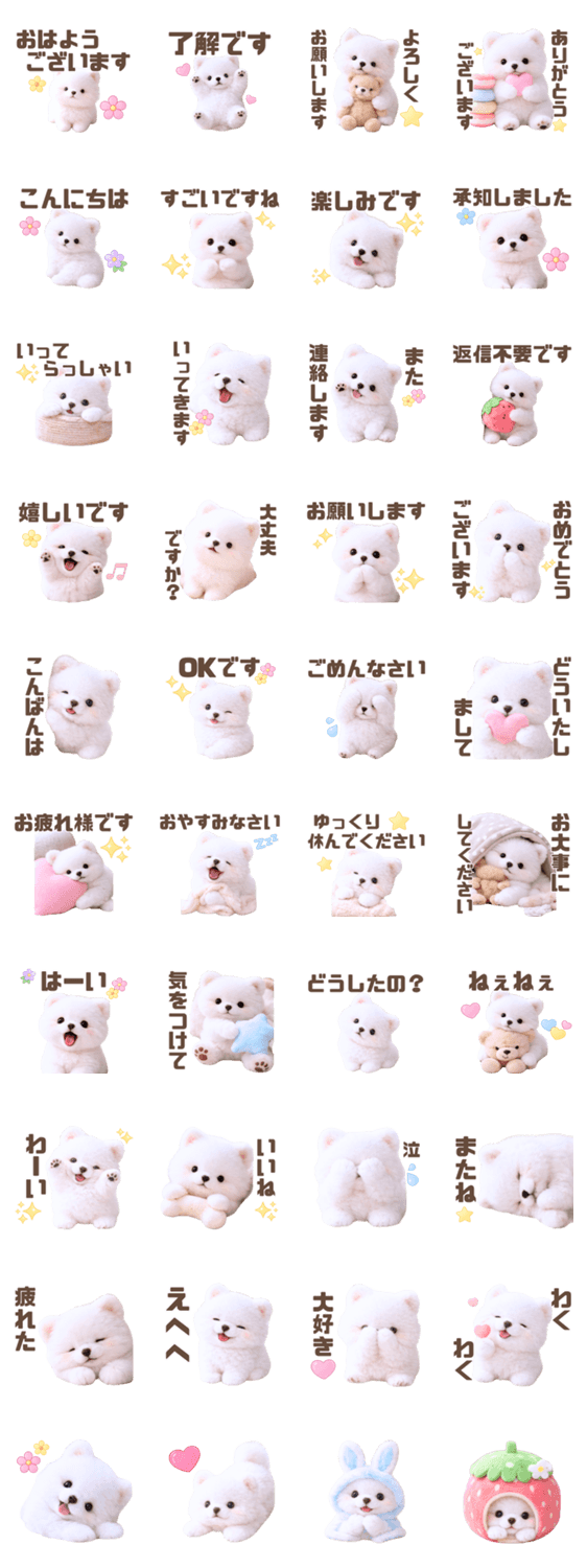 | スタンプ説明 | かわいい/ふわふわ/白ポメ/犬/敬語/丁寧/あいさつ/日常/使いやすい/癒し/返信/会話/家族/友達/仕事/接客/いつでも/気づかい/大人/一年中/デカ文字/見やすい/シニア/トーク |