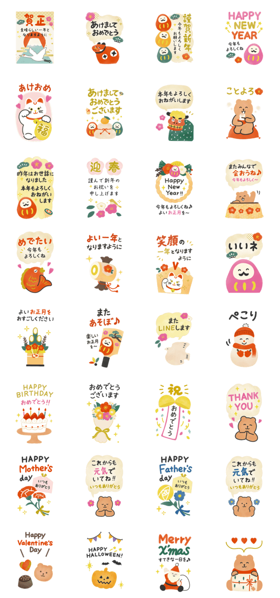 ふんわりタッチのやさしいビッグスタンプです。お正月・年末年始に加えて季節のお祝い入りで1年中使えます。 ※こちらは再販です 年賀状/母の日/父の日/誕生日/入学祝い ※このスタンプはトークルームで大きく表示されるBIGスタンプです。