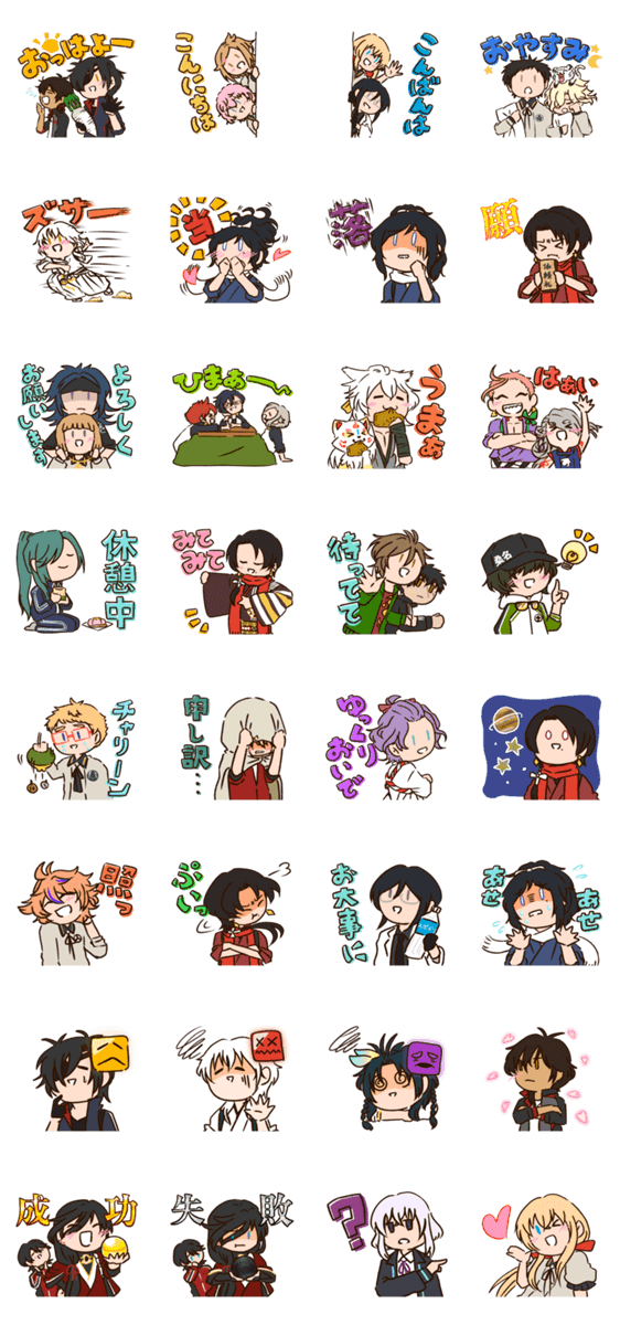 | スタンプ説明 | 年に一度しか主が帰ってこない本丸の、賑やかでのんびりとしたスタンプ。前回にはなかった挨拶系を増やしました。 ※LINE Creators Collaboration『刀剣乱舞ONLINE』参加スタンプです。 |
