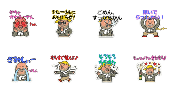 | スタンプ説明 | 夜の街のやり取りに!「シャンパン飲もう」「すっからかん」等、愛嬌あるおじさんが深夜のトークを盛り上げます。同伴やアフター、飲み仲間との連絡にもぴったり! |