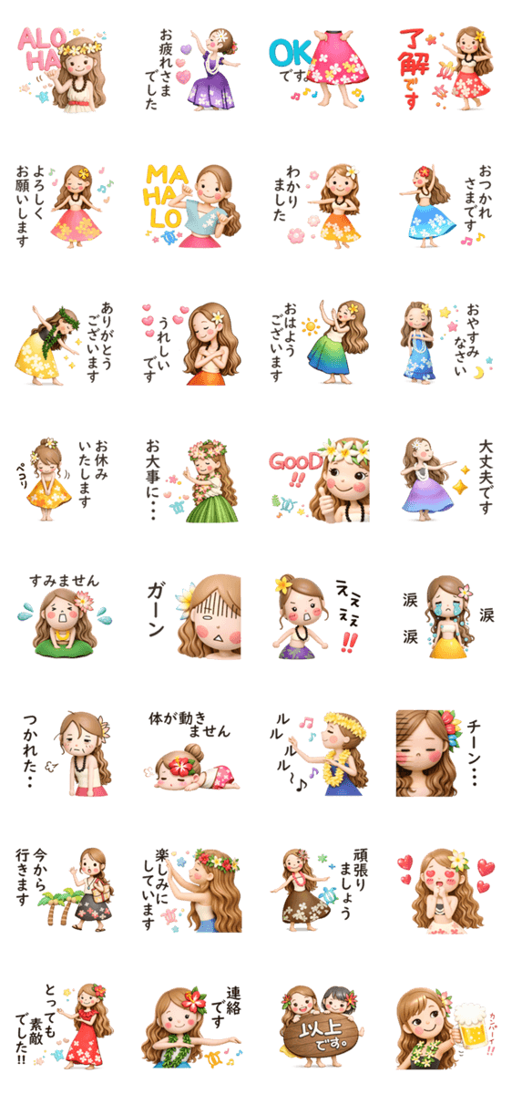 | スタンプ説明 | フラダンスが好きな人のためのスタンプです!立体3Dぷっくり女の子/ハワイ/アロハ/マハロ/習い事/海/レッスン/ママ友 |