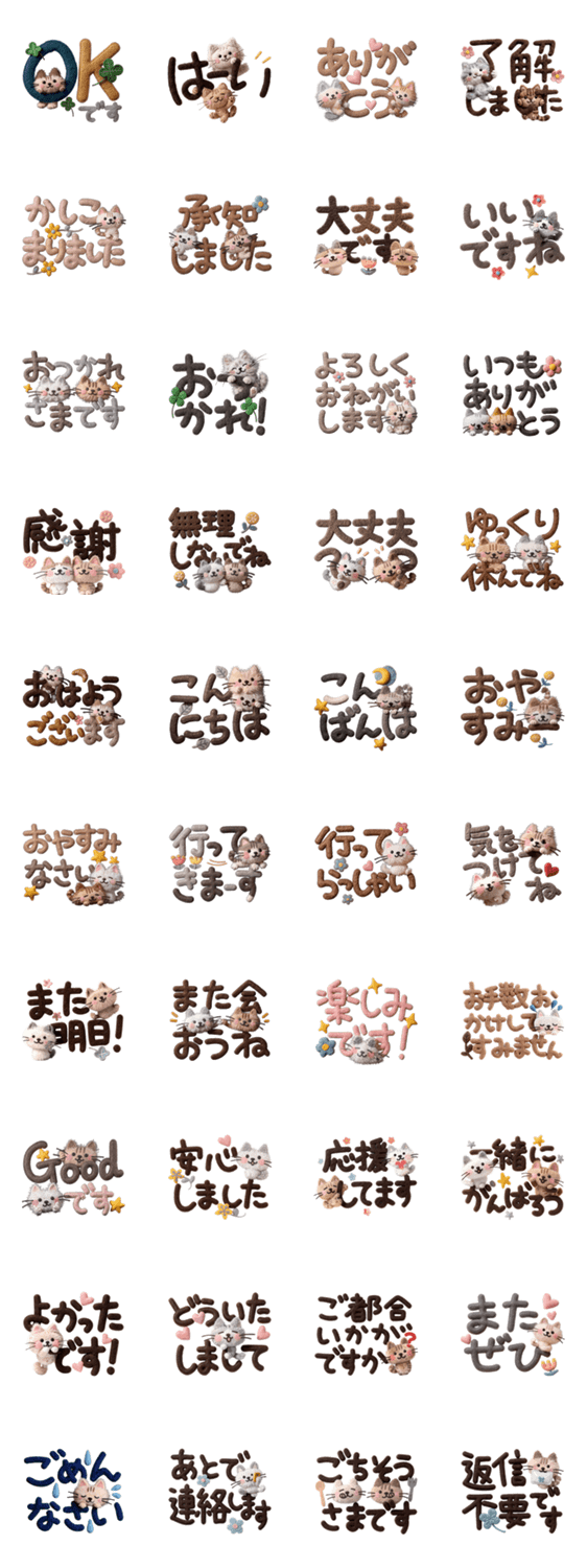 | スタンプ説明 | 大きな文字に子猫がいっぱい♪過去作品をぷっくり調にしてみました。 敬語/猫/挨拶/子猫 |