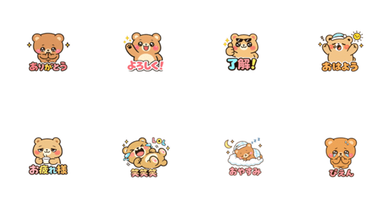 | スタンプ説明 | 表情豊かなクマさんが、あなたの気持ちをゆる〜く伝えます!「ありがとう」「了解」など、毎日のトークで使いやすい挨拶を揃えた8枚セットです。 |