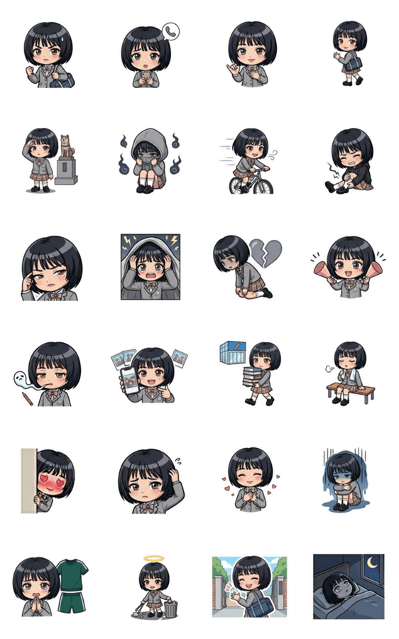 | スタンプ説明 | ミニボブ女子.学生.女子高校生の日常(JK.JC)中学生.自転車.ブレザー.制服.眠い.寝不足.眠れない.部活.応援.待ち合わせ.黒髪.また明日.足痛い.ありがとう.チャリ通.約束. |