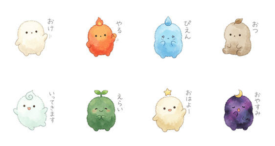 | スタンプ説明 | 8体の精霊兄弟たちが、毎日の気持ちをふわっとお届け。その日の気分で推しの一匹を選んで送れる、癒しの家族スタンプです。 |