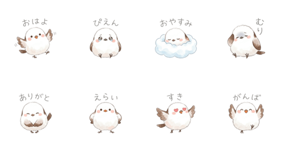 | スタンプ説明 | 雪の妖精、シマエナガ。まるっとした白い姿で、おはよう・ありがとう・おつかれさまをふわっと運びます。毎日のやりとりを、ちょっとだけやさしくする癒しセット。 |