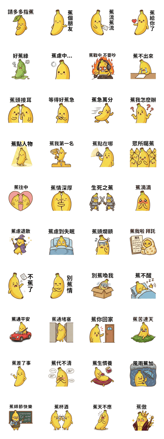 | スタンプ説明 | 40 banana stickers to spice up your daily chat. From "Going Bananas" to "Peel-ing Fine," these expressive fruits help you vent, joke, and socialize with style! |