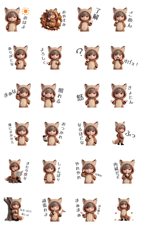 | スタンプ説明 | 3Dのぷにぷに質感がかわいい、ダ淡色男子、キツネ日常スタンプです。恋人/カップル/ペア/友達/家族/挨拶/男の子/クール/動物/もふもふ/狐/着ぐるみ/俺様 |