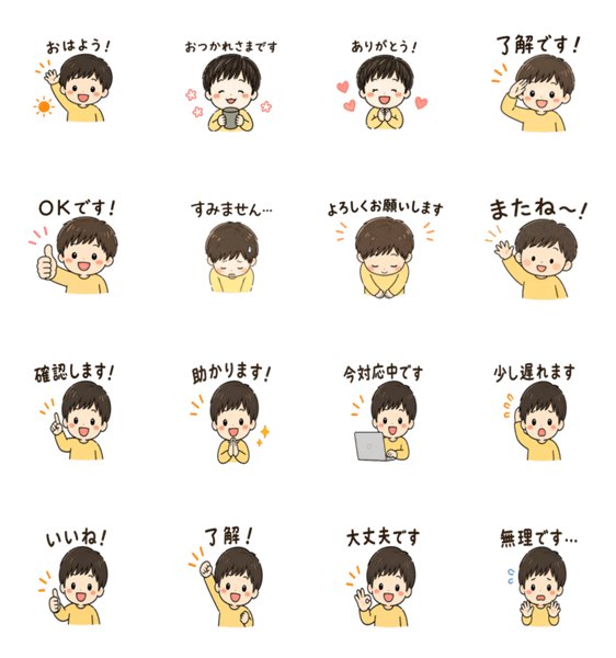 | スタンプ説明 | やさしい男の子が毎日使える言葉をお届け。お仕事にも日常にも使える、シンプルで誰でも使いやすい16個セットです。 |