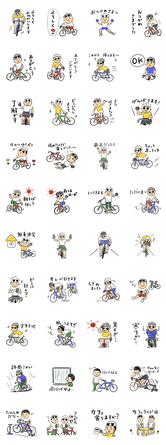 | スタンプ説明 | ロードバイク好きな人のスタンプです。 第2弾です。サイクリングのひとコマを共有するのにぴったり。 自転車に乗って楽しも〜 |