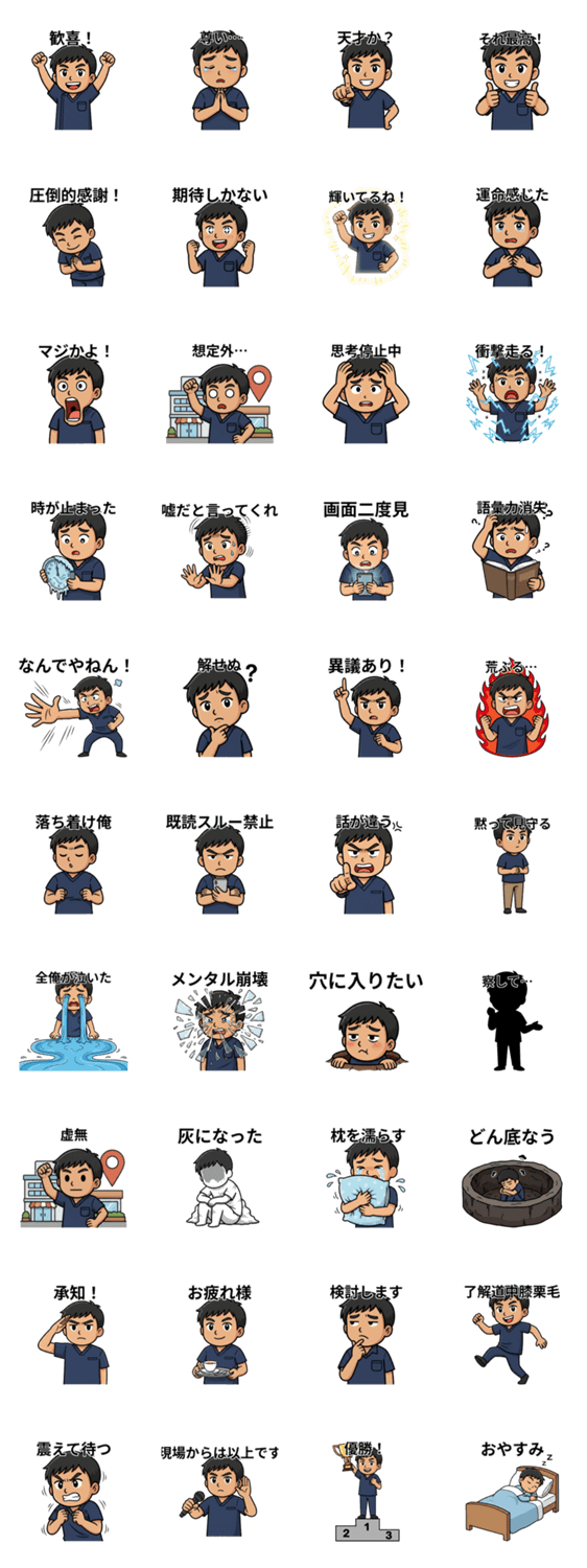 | スタンプ説明 | 男性療法士の日常をゆるく描いたスタンプ第7弾!プライベートで使える使いやすい基本の挨拶を揃えました。 |
