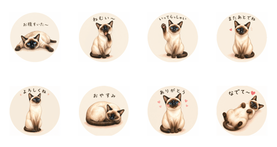 | スタンプ説明 | 水彩タッチのシャム猫が、日常のひとことをお届け!おはようからおやすみまで、毎日のトークをかわいく彩ります。 |