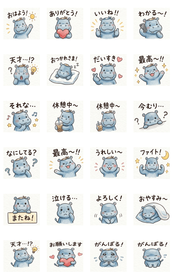 | スタンプ説明 | カバのキャラクターが登場!日常のやりとりにぴったりなほっこりスタンプです。 |